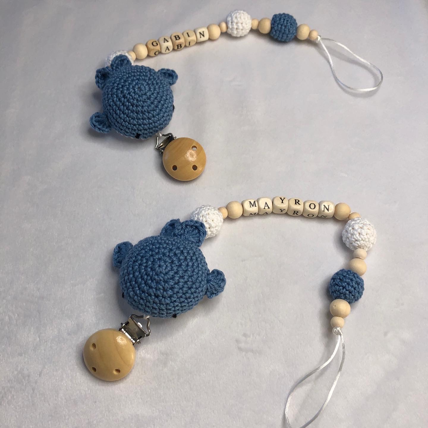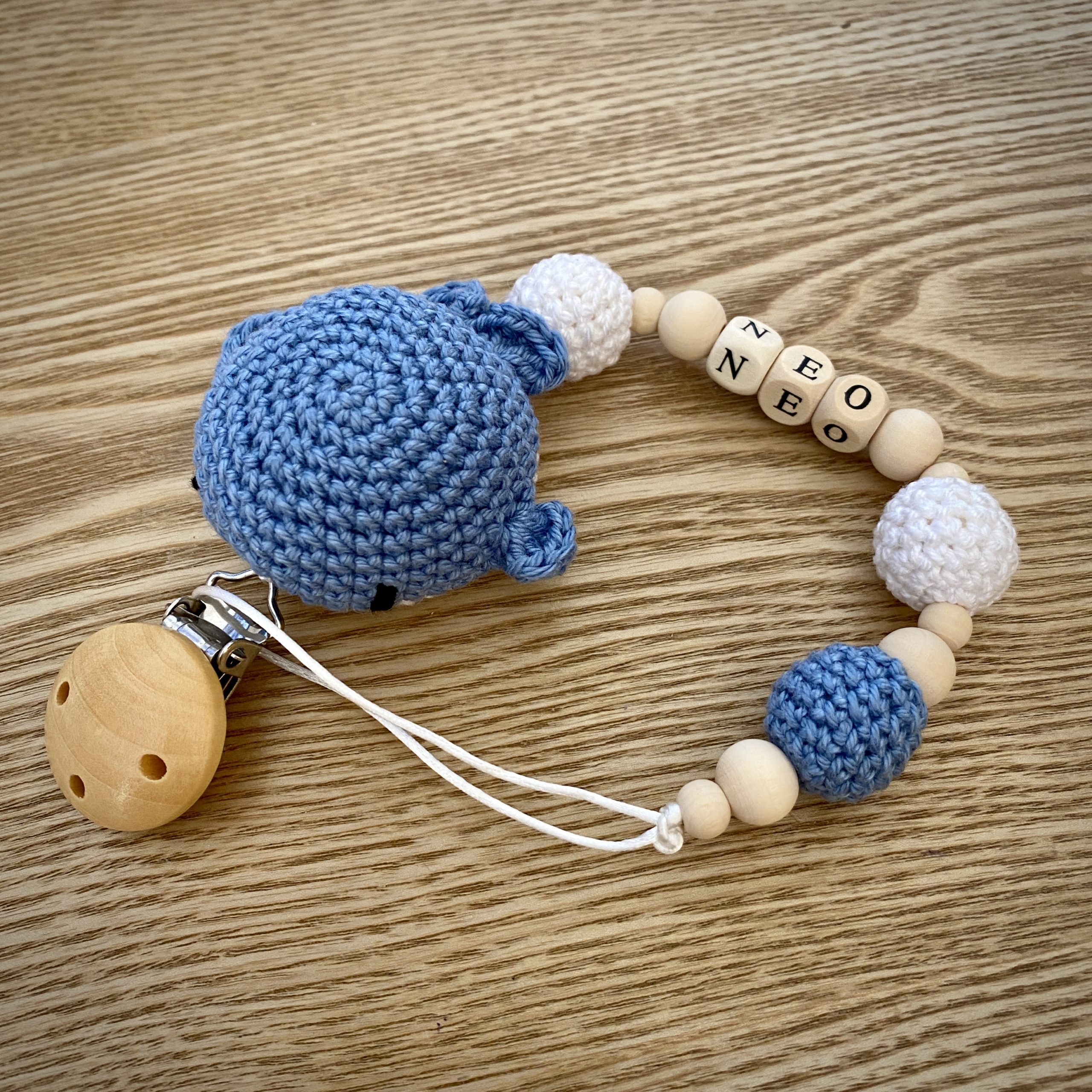 Matériaux utilisés : laine 100% coton (Phildar et Scheepjes), perle en bois naturel, mousse de rembourrage 100% polyester, clip en bois de hêtre sans BPA et cordon satin soie intérieur nylon.