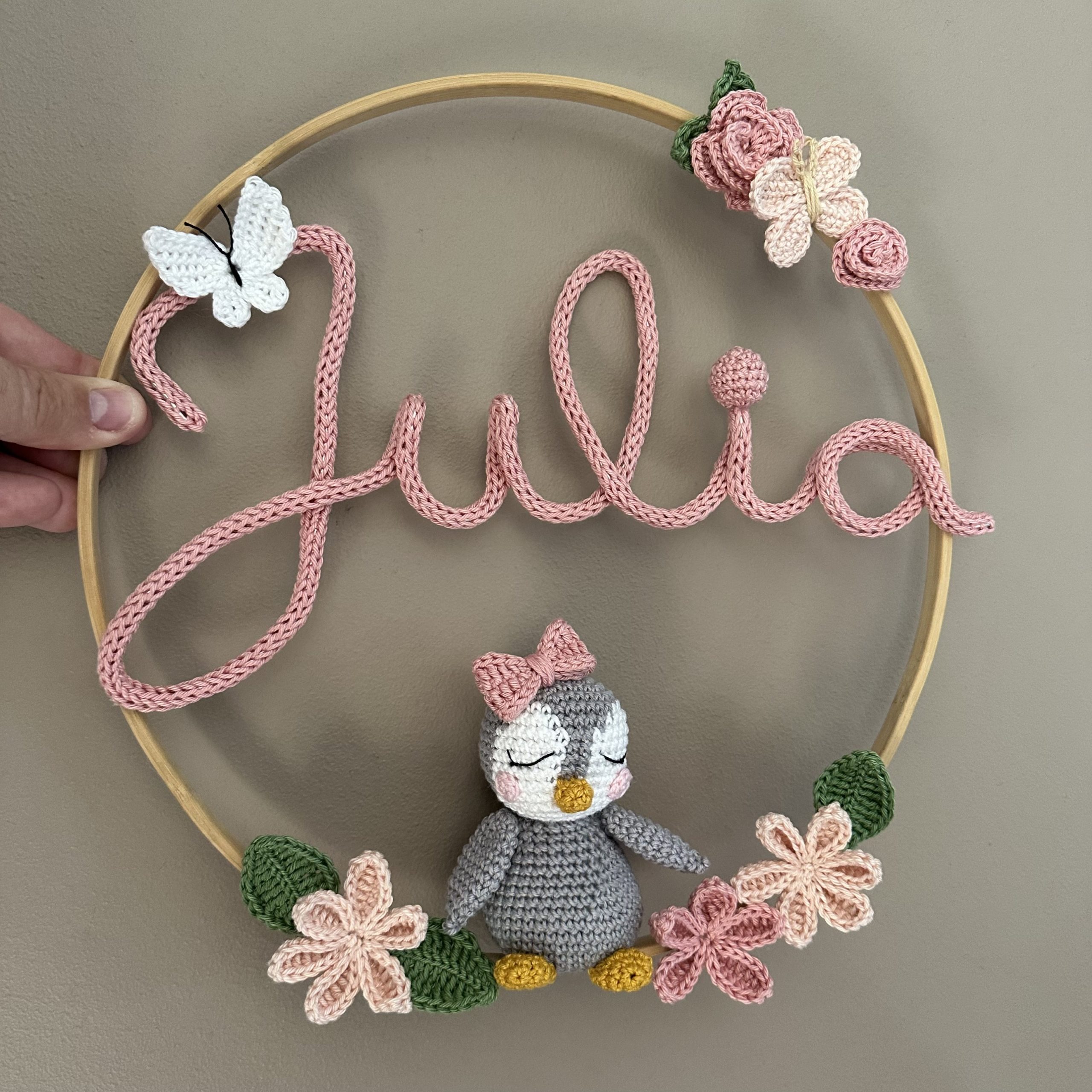 Description : inscription réalisé au tricotin avec de la laine. Le pingouin, les feuilles, fleurs et papillons sont réalisés au crochet. Le tout fixé sur une couronne en bois de 30 cm de diamètre. Tout est confectionné par mes soins.